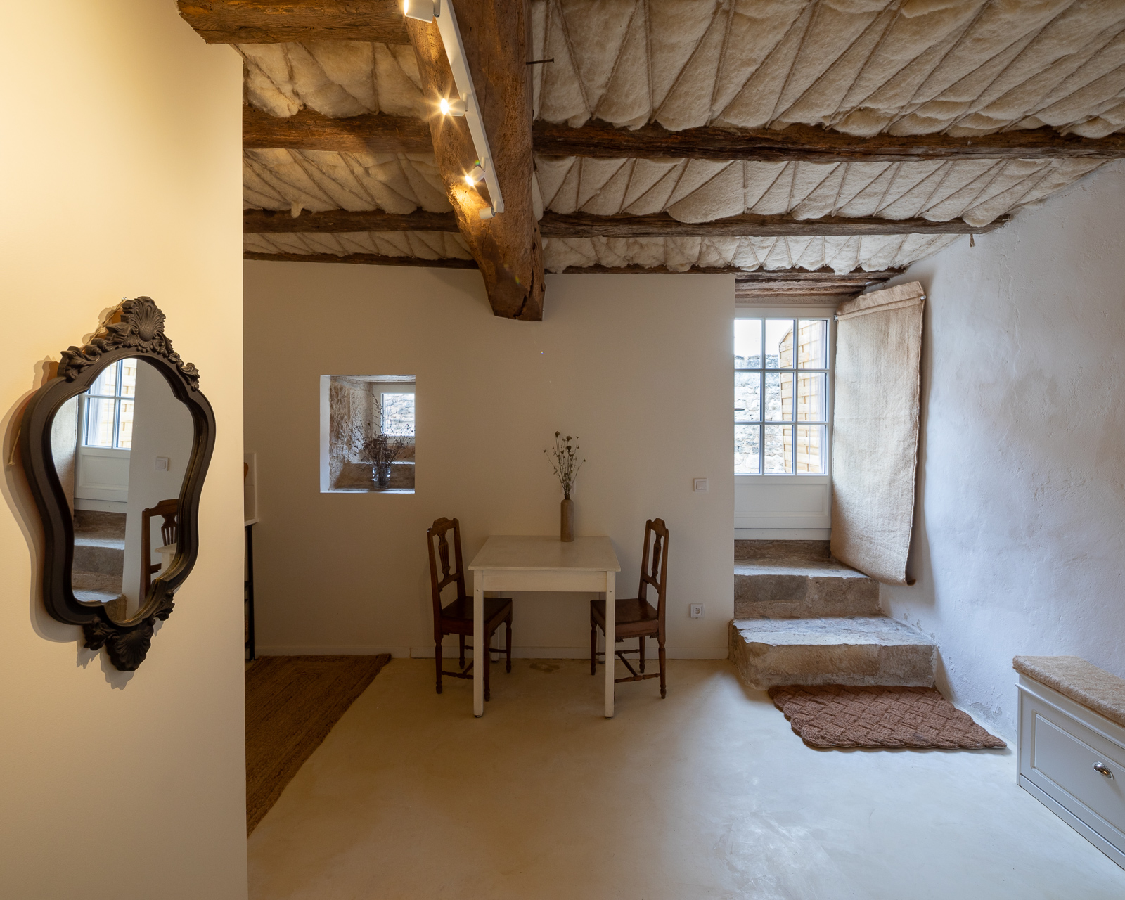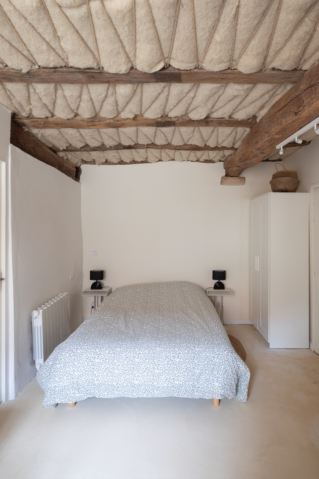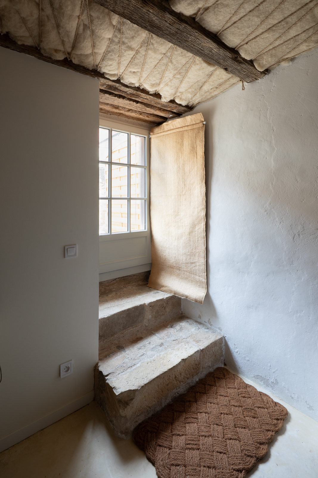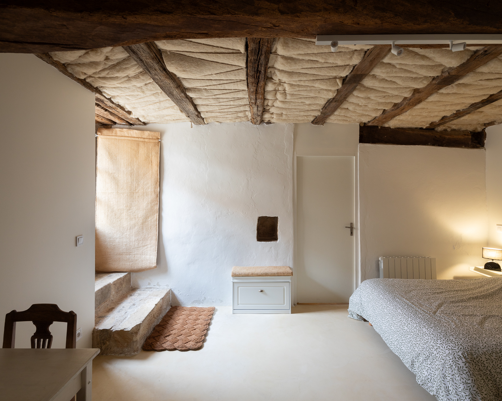 Le plancher haut a été isolé avec soin : un remplissage en laine naturelle maintenu par un tressage de cordes entre les solives apparentes en bois. Les murs en pierre ont été isolés à la paille et recouverts d’un enduit à la chaux teinté dans des tons naturels.