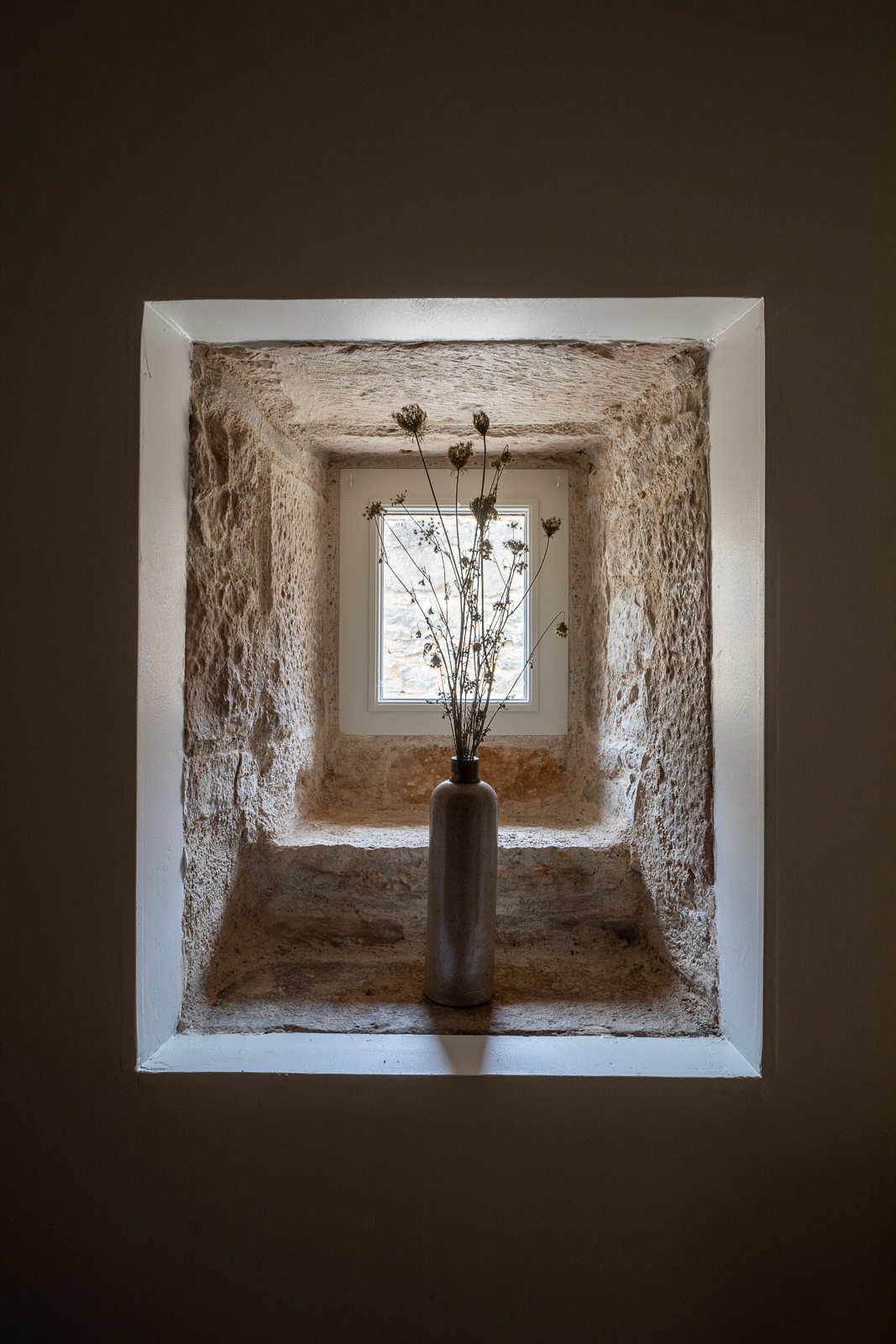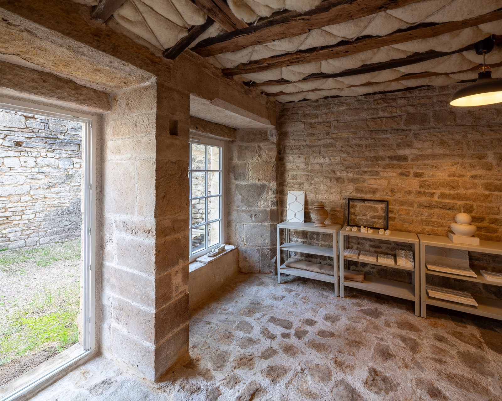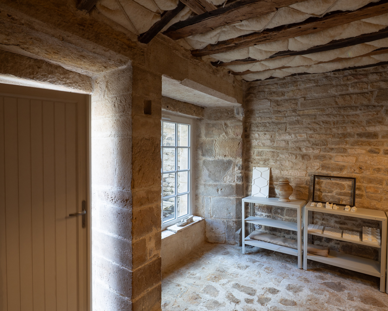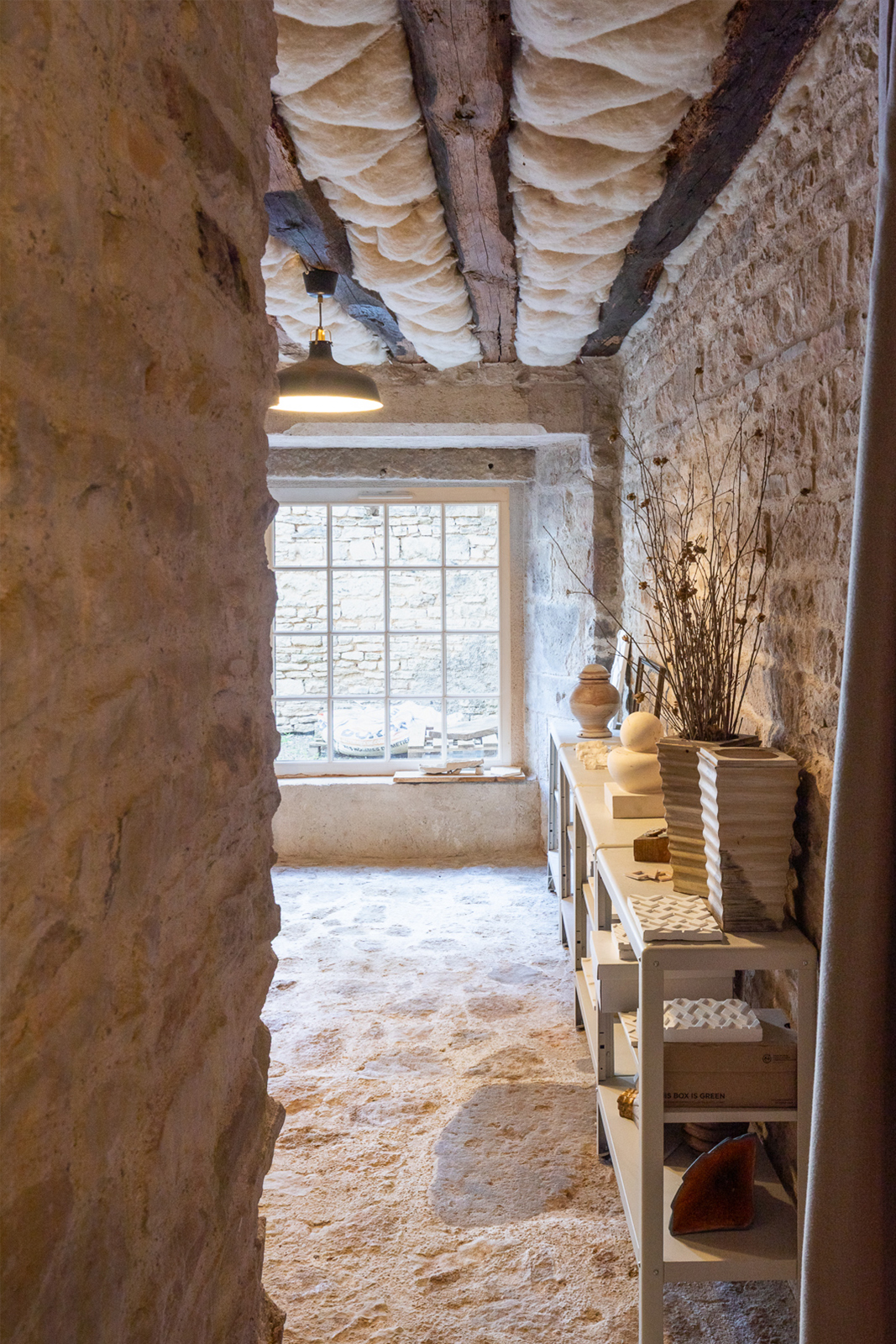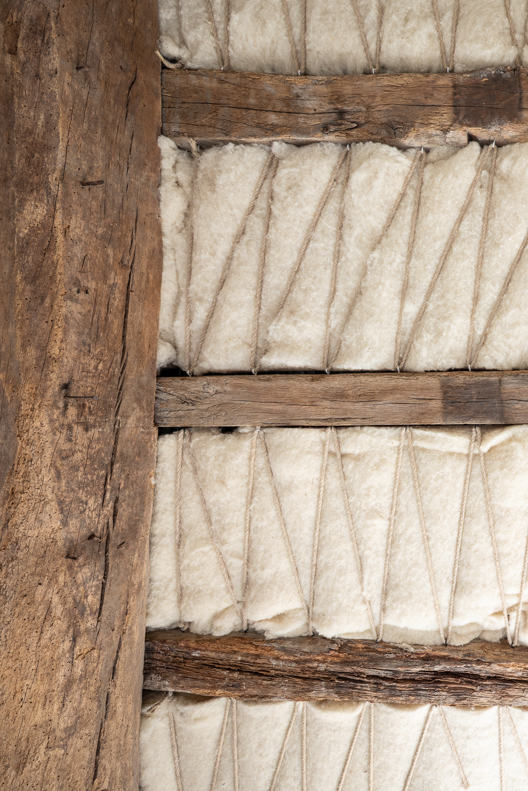 Le plancher haut a été isolé avec soin : un remplissage en laine naturelle maintenu par un tressage de cordes entre les solives apparentes en bois. Les murs en pierre ont été isolés à la paille et recouverts d’un enduit à la chaux teinté dans des tons naturels.