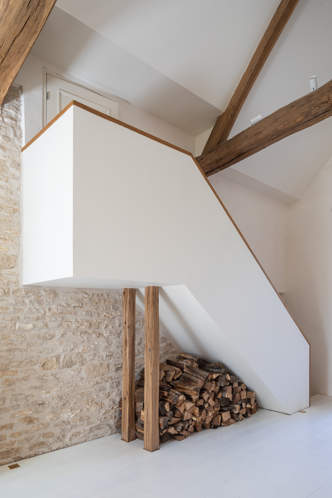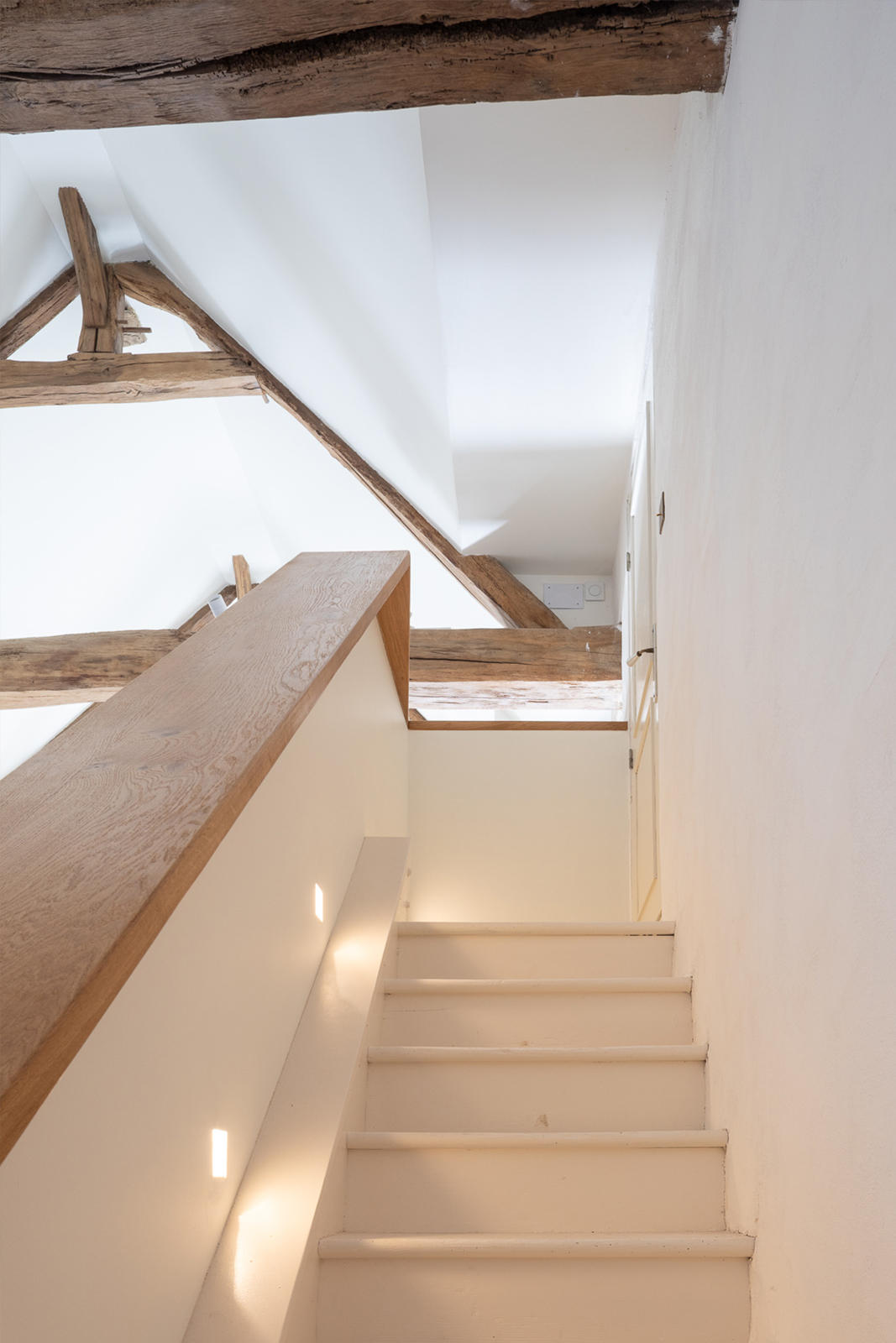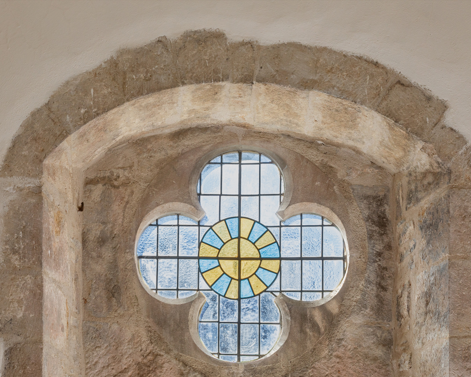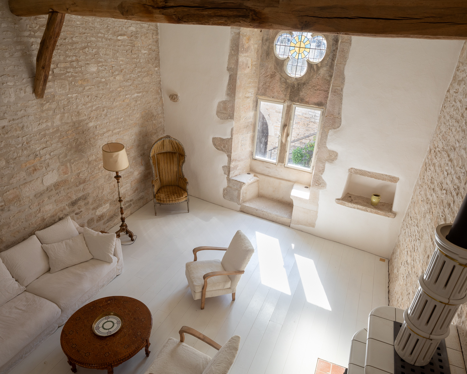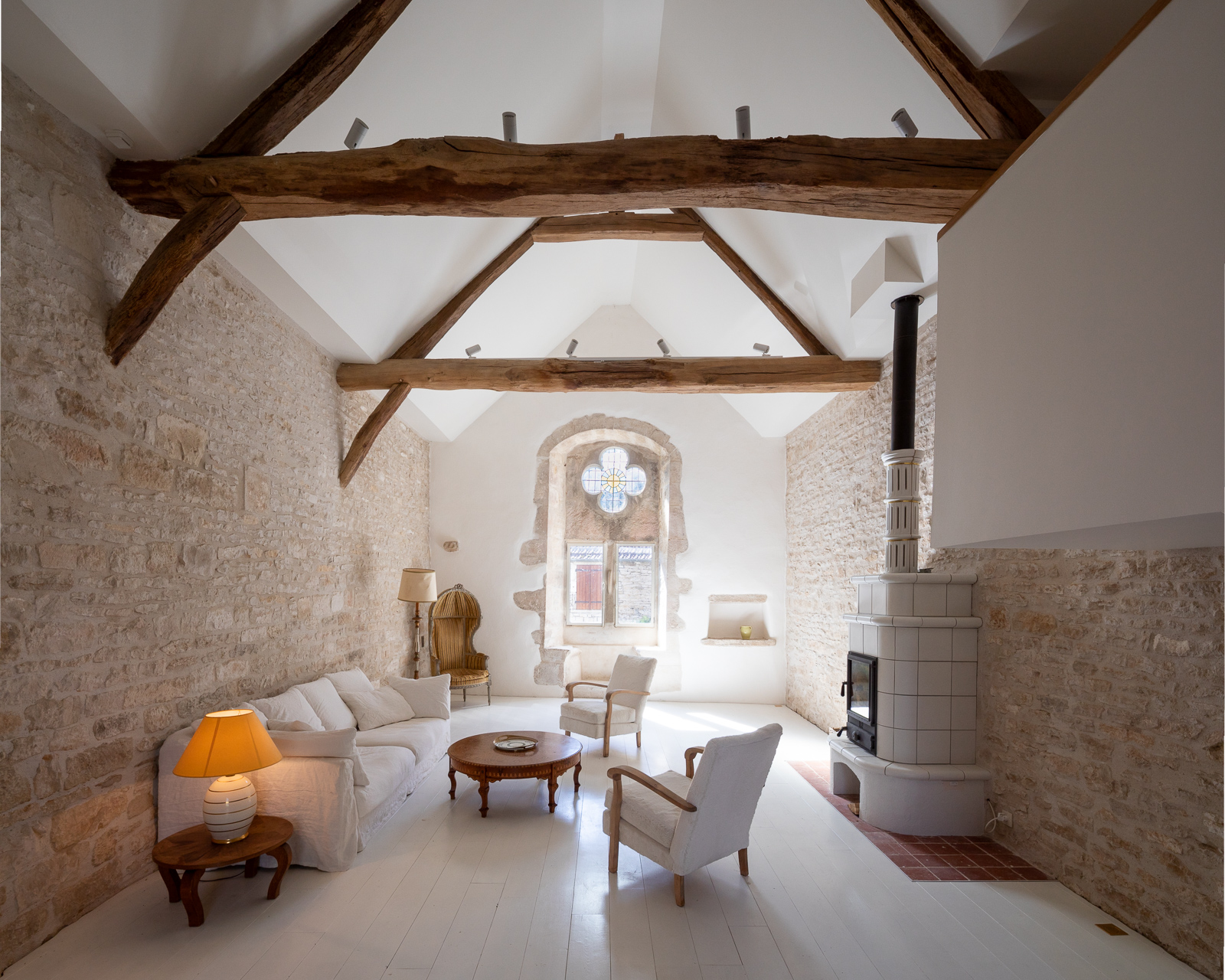 Le choix s’est porté sur une ambiance très douce qui valorise la pierre et les fermes de la charpente. Le parquet en chêne du Morvan est teinté en blanc pour offrir un maximum de luminosité à l’espace. Les façades donnant sur l’extérieur sont réalisées avec un enduit chaux et paillettes de chanvre pour assurer la correction thermique. Sur les parties latérales nous avons conservé la pierre vue qui a été nettoyée et rejointoyée. Enfin nous avons fait réaliser une étude d’éclairement pour permettre de valoriser au mieux l’éclairage des coussièges et de la grande baie dans laquelle ils s’intègrent. Coussièges que nous avons pour l’un restauré et l’autre restitué.