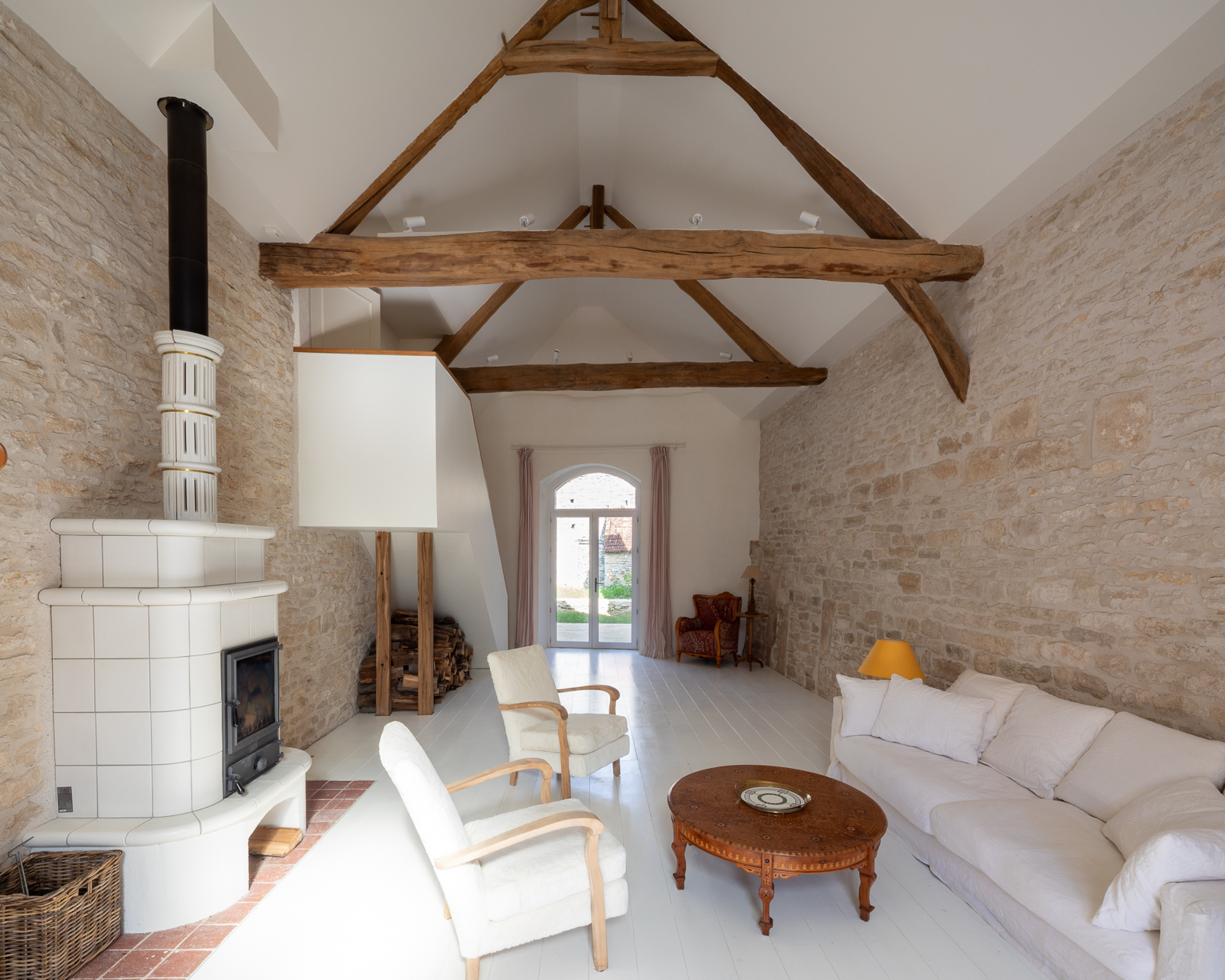 Le client possède le volume adjacent qui est déjà aménagé et souhaite créer un grand salon dans cette grange au même niveau que le reste de la maison. Le projet consiste ainsi en la création d’un plancher isolé, l’adaptation d’un escalier existant, l’isolation complète de la grange et la restauration du volume. Nous avons également créé une porte fenêtre qui donne sur le jardin arrière.