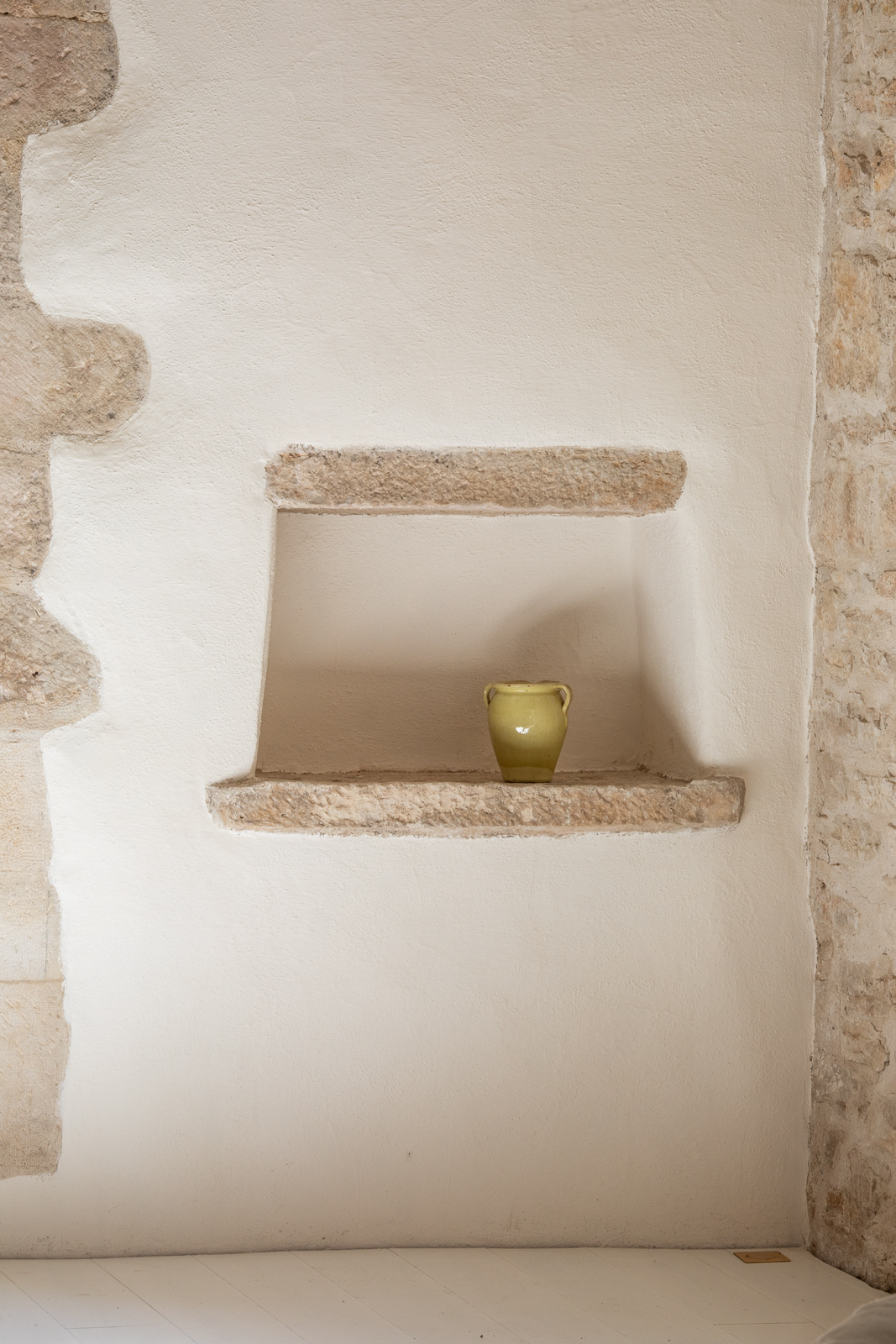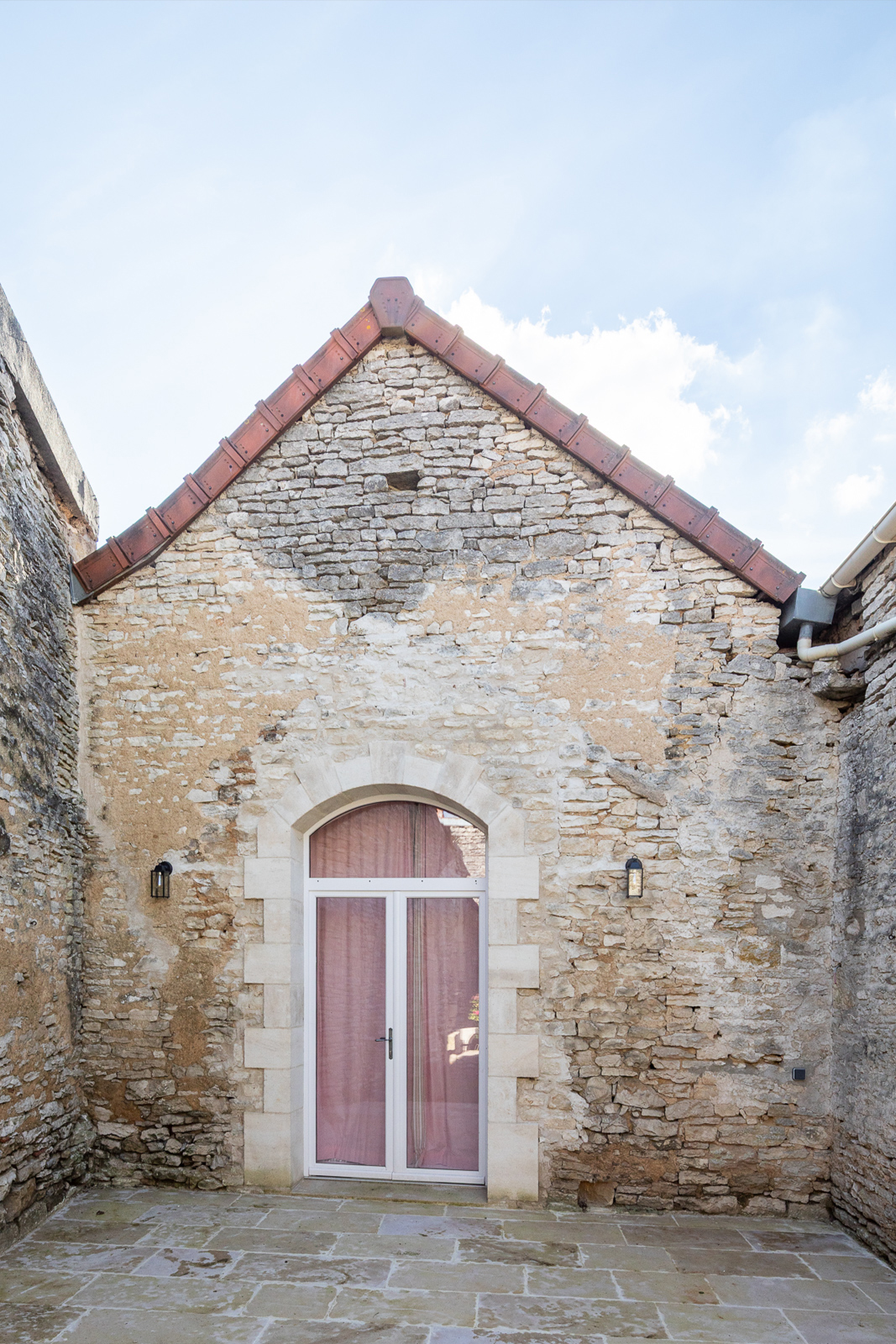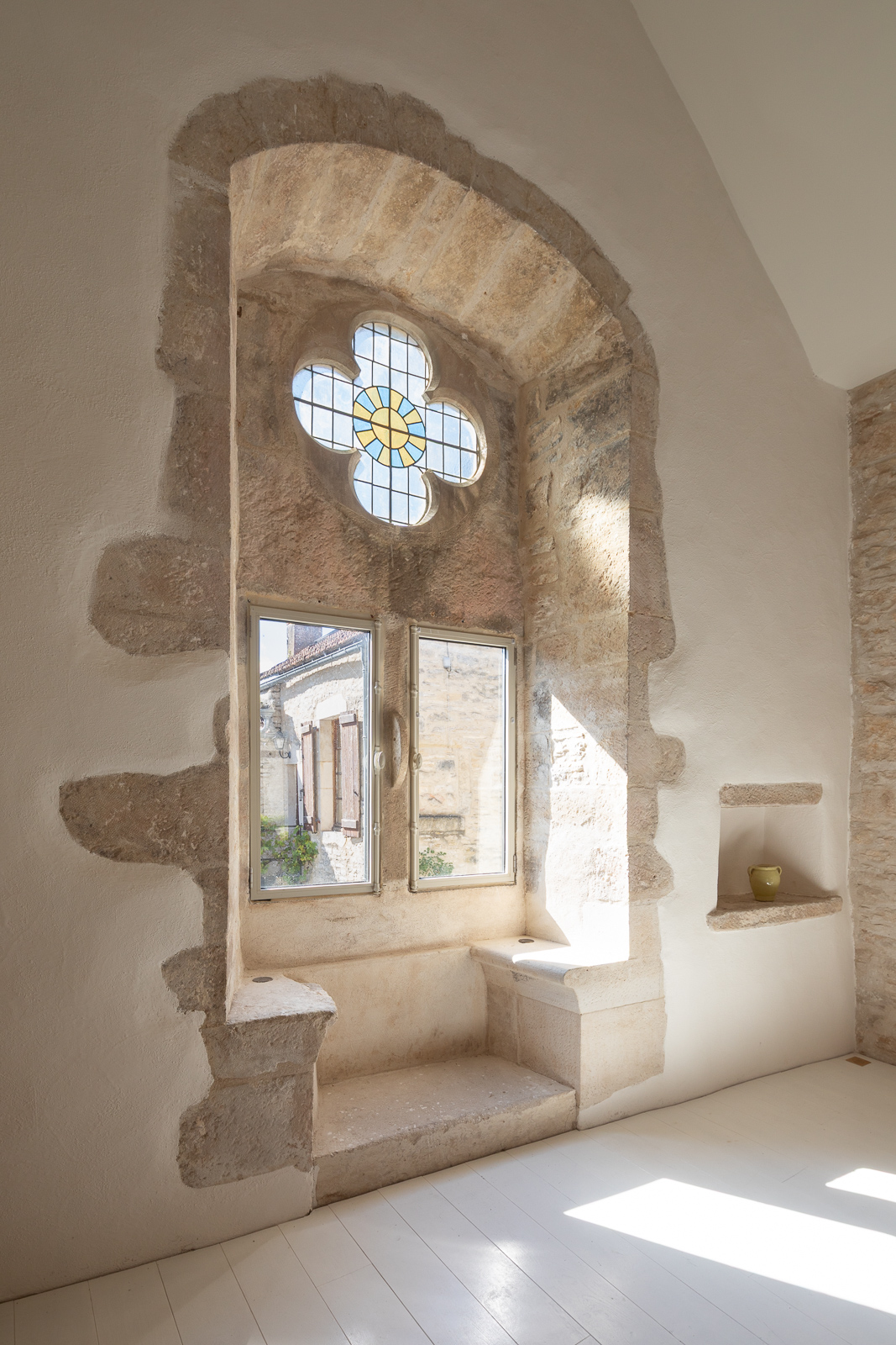 Cette maison est caractéristique de l’architecture urbaine médiévale du XIII°. Utilisé en grange depuis longtemps et ne disposant plus de planchers intermédiaires, le volume dans lequel nous intervenons est quasiment brut. On distingue au milieu des moellons de pierres calcaire les restes d’un probable coussiège. Les murs latéraux révèlent les anciennes connections au bâtiment voisin. Les baies géminées sont surmontées d’une rose dont le remplage fut remplacé très récemment.