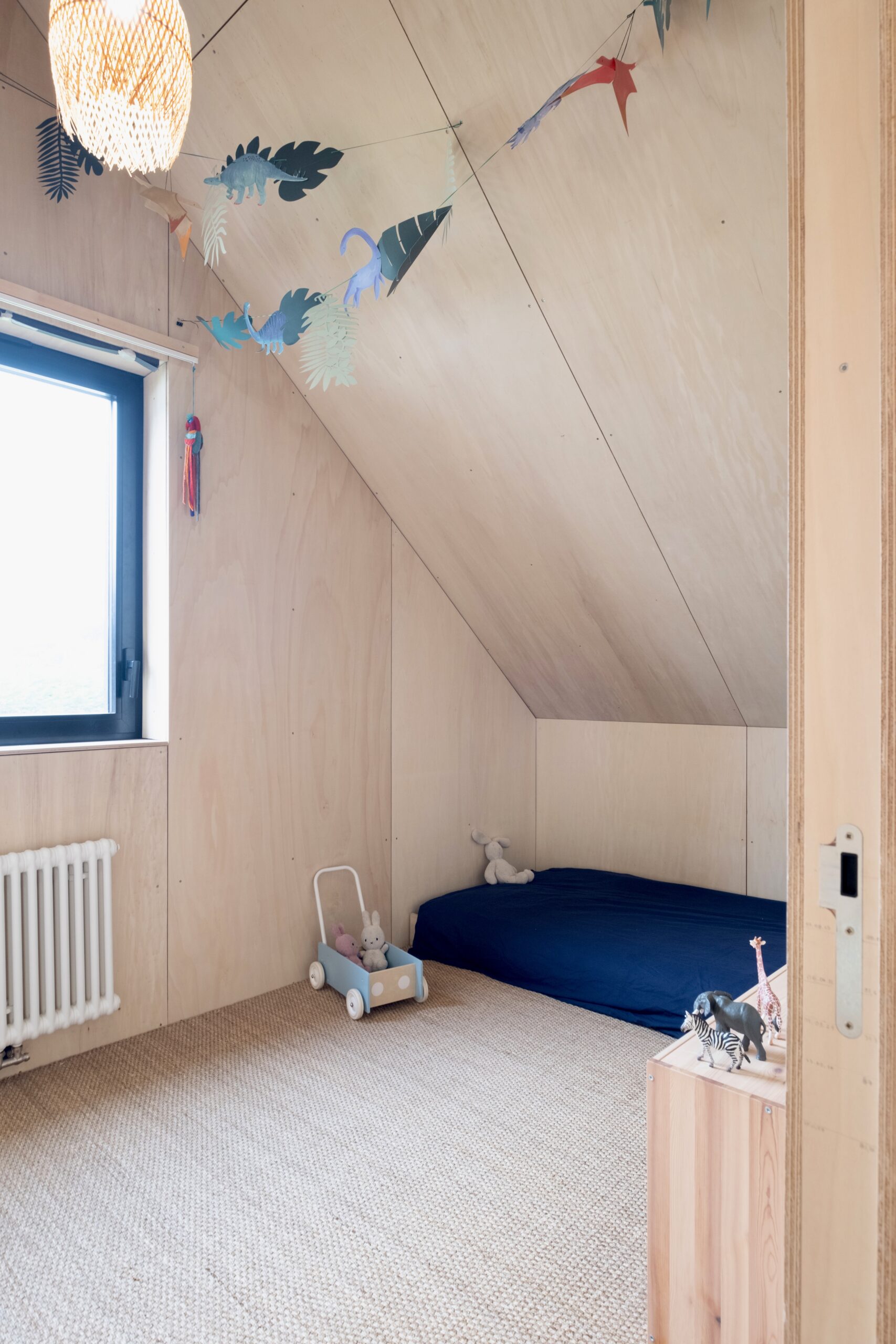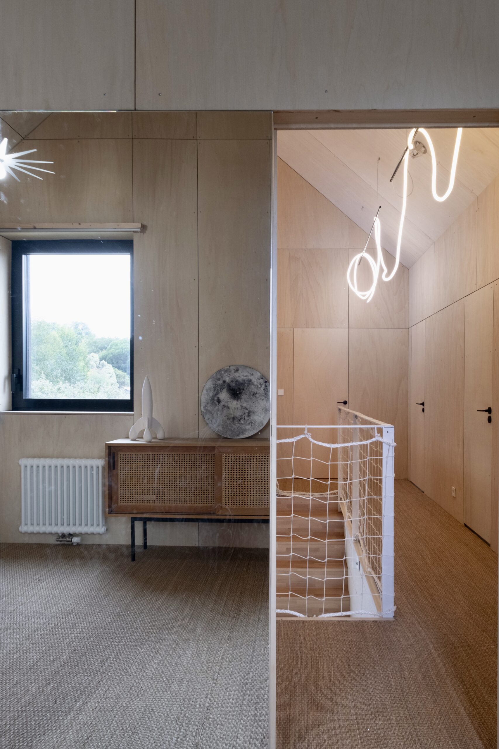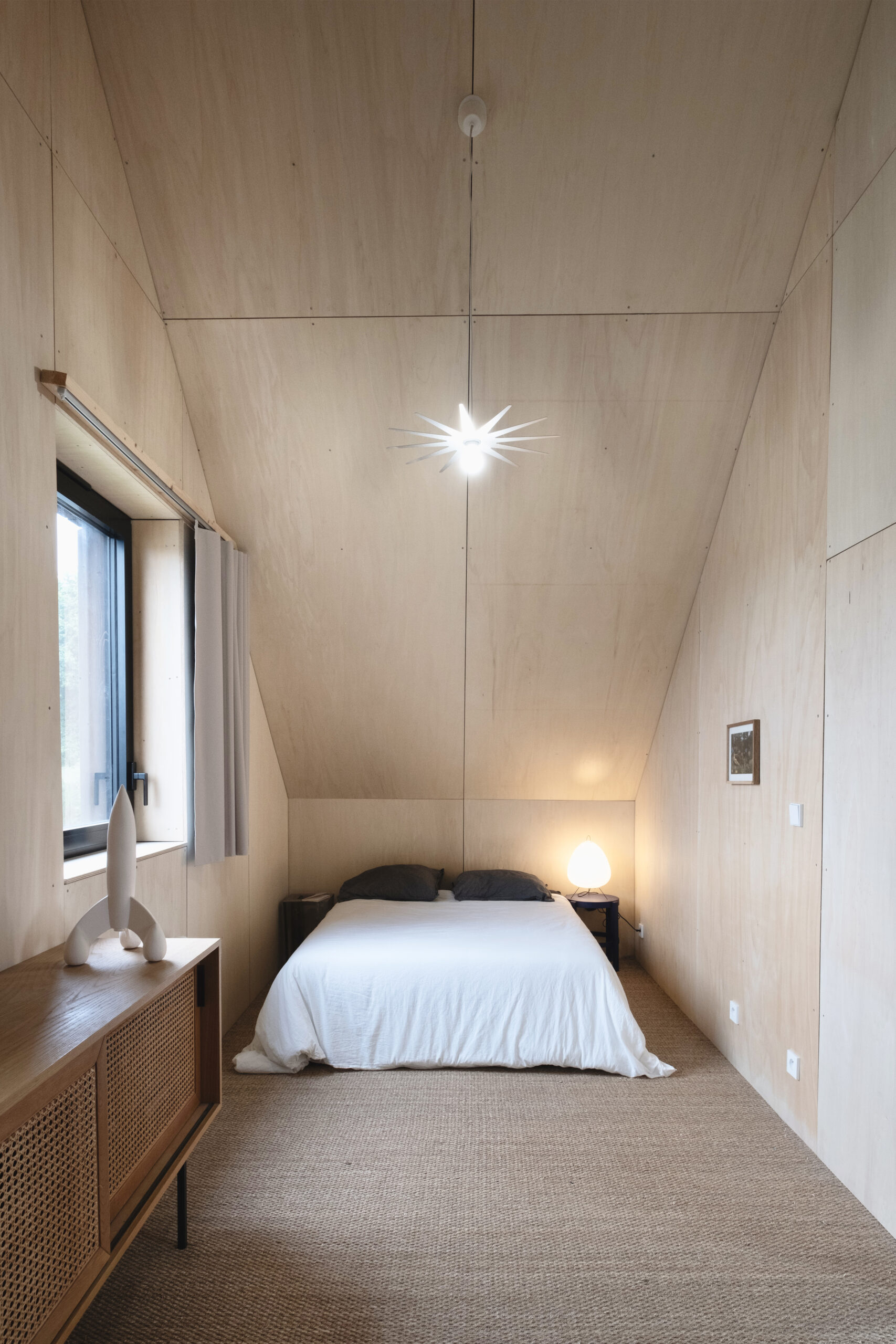 L’architecture revisite le pavillon traditionnel avec une écriture contemporaine : béton, verre, bois et métal s’associent dans une esthétique sobre et élégante. L’étage, en ossature bois revêtu de panneaux de peuplier, unifie murs, rampants et portes, apportant chaleur et cohérence à l’ensemble.