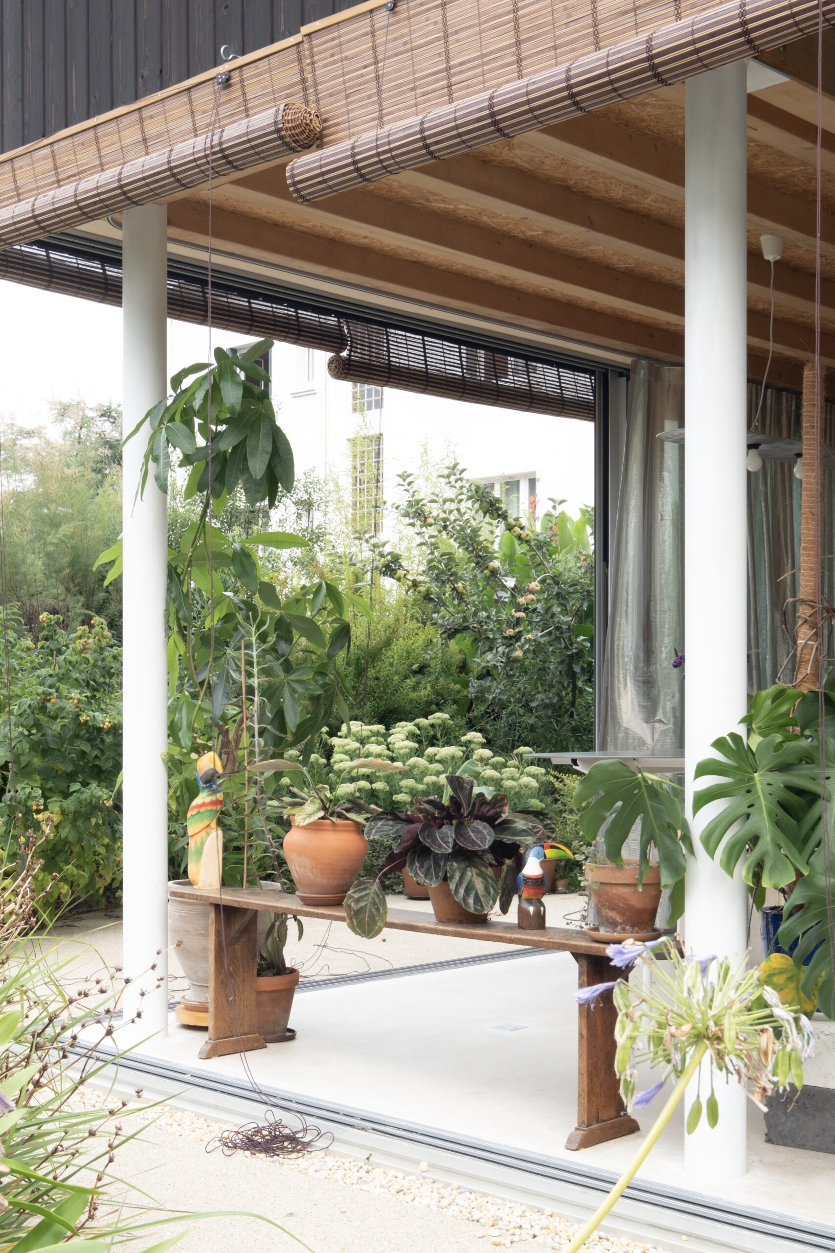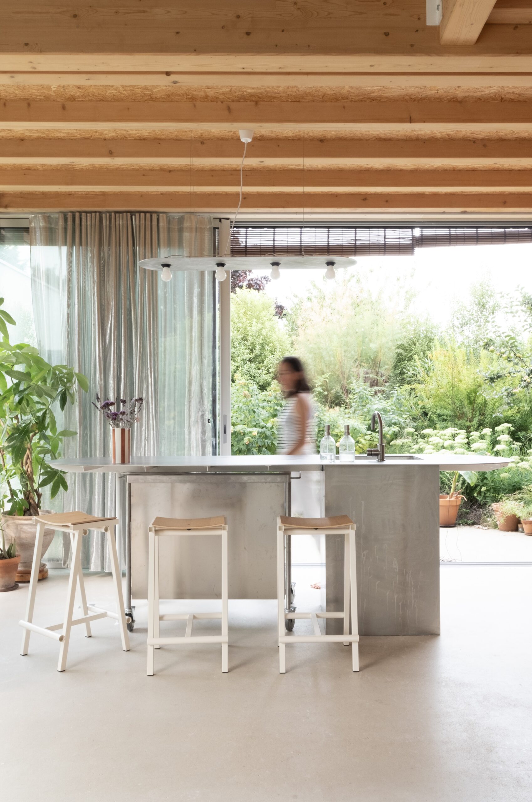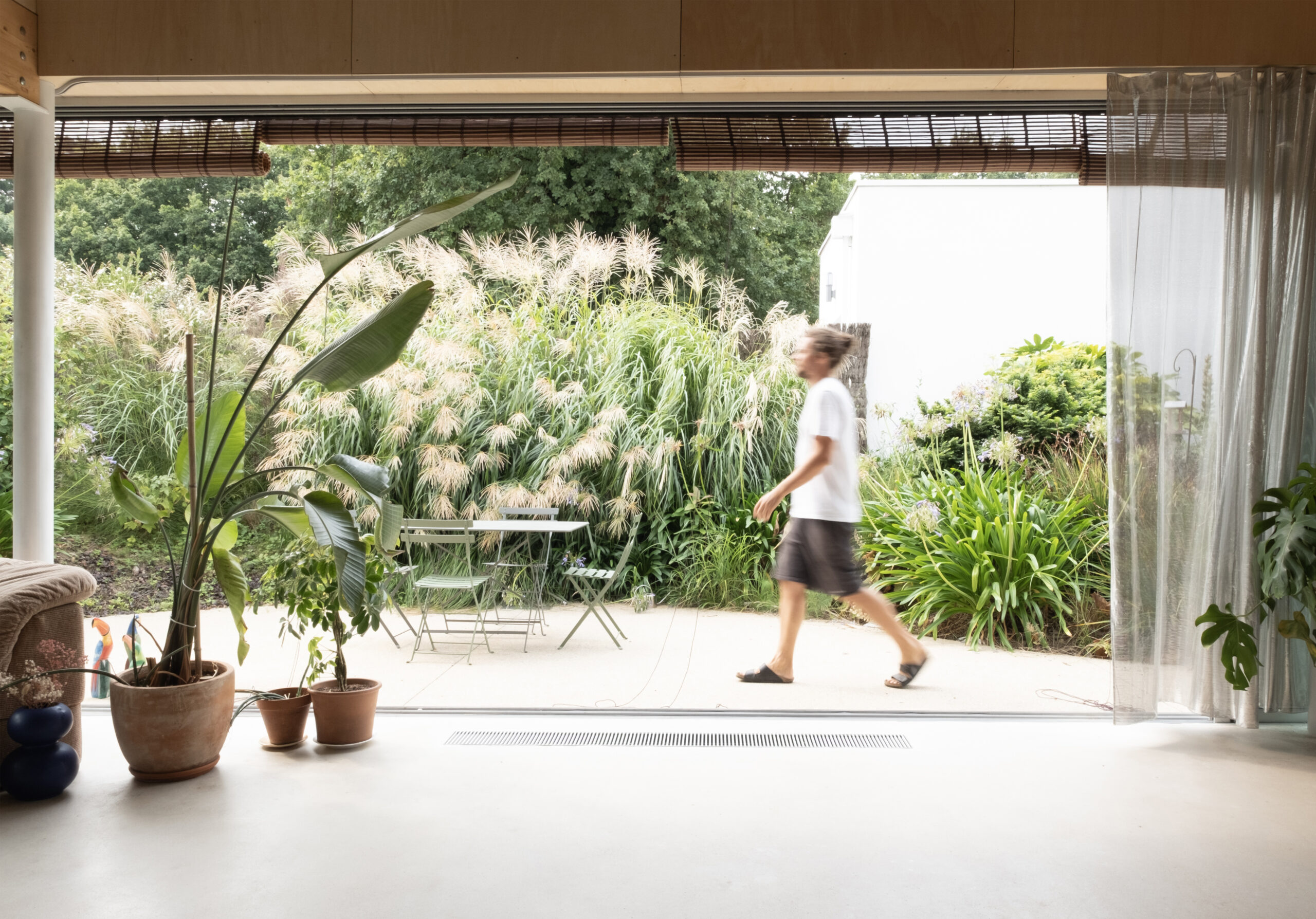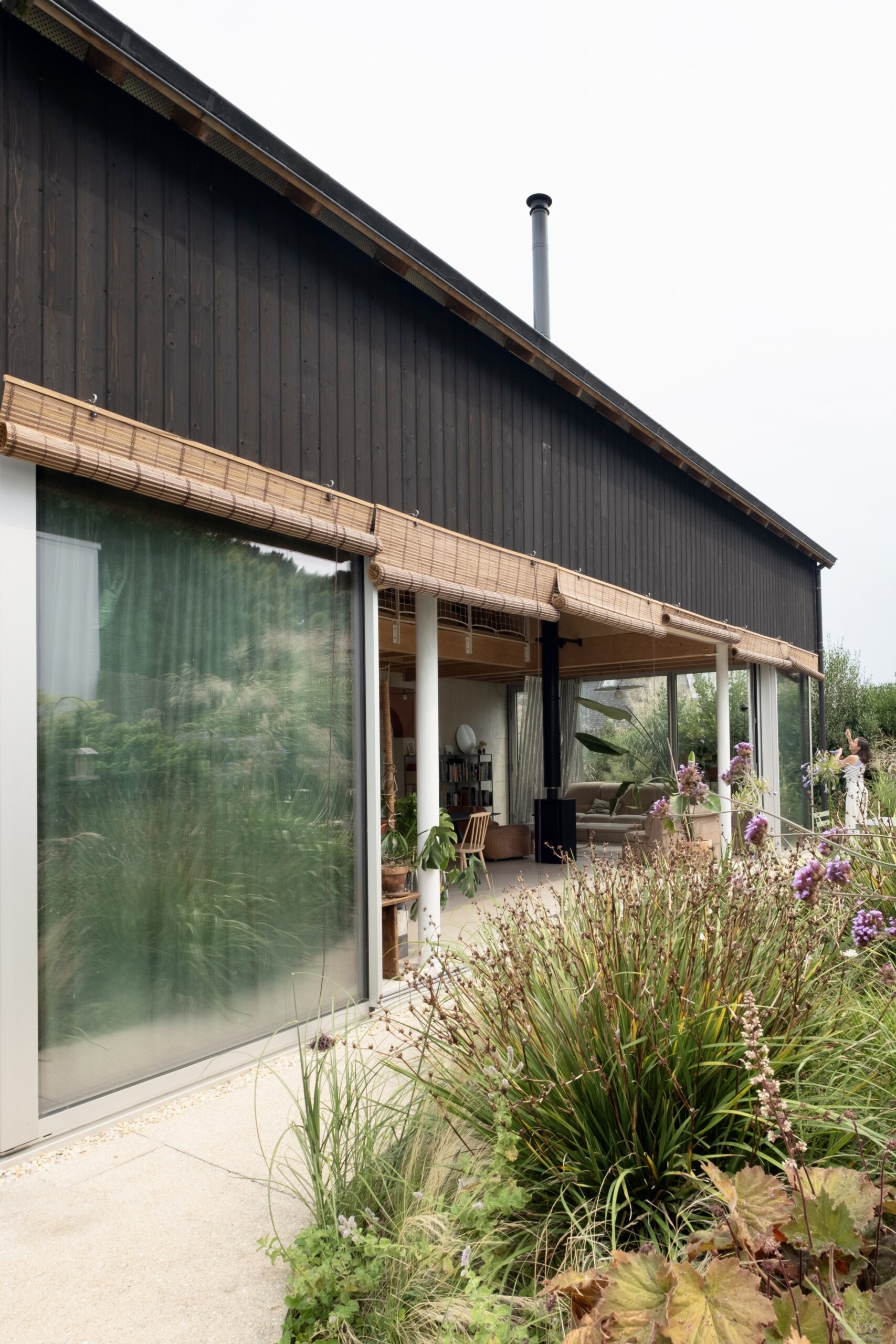 Largement vitrée sur trois façades, la maison baigne dans la lumière naturelle et offre une continuité fluide avec le jardin. Les grandes baies vitrées favorisent un dialogue permanent entre intérieur et extérieur, renforçant une sensation d’espace et de liberté.